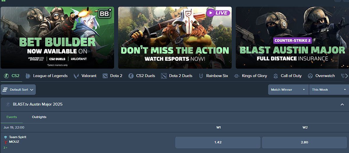 Pokrivanje e-športa pri Duelbits je impresivno. Čeprav platforma nima ločenega oddelka za e-šport, boste v oddelku za športne stave našli dolg seznam iger, vključno s CS:GO, League of Legends, Dota 2, Call of Duty, Rocket League, PUBG in drugimi. Za velike tekme je na voljo več kot 250 stavnih trgov.
