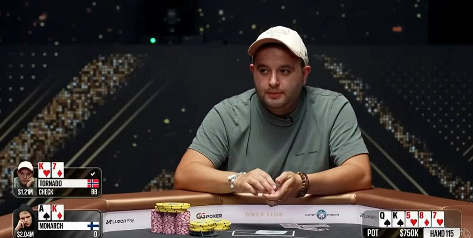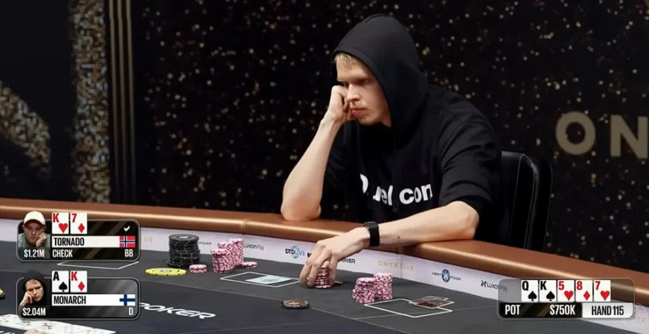 Monarchas atidarė su A♠ K♦ ir prieš flopą padidino statymą iki 50 000 dolerių, o Tornado gynėsi su K♥ 7♦.